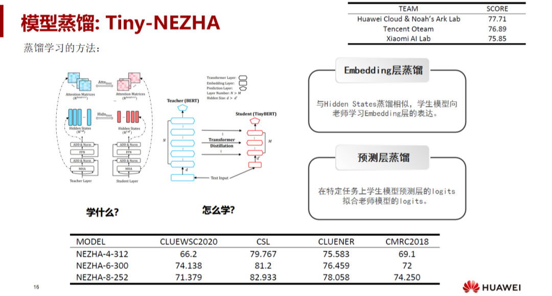 我们有没有其他方法去解决呢?有的,可以使用一些模型蒸馏的方法来解决,例如上图 Tiny-NEZHA 这样一个蒸馏的方式去把大模型去蒸馏到小模型里。