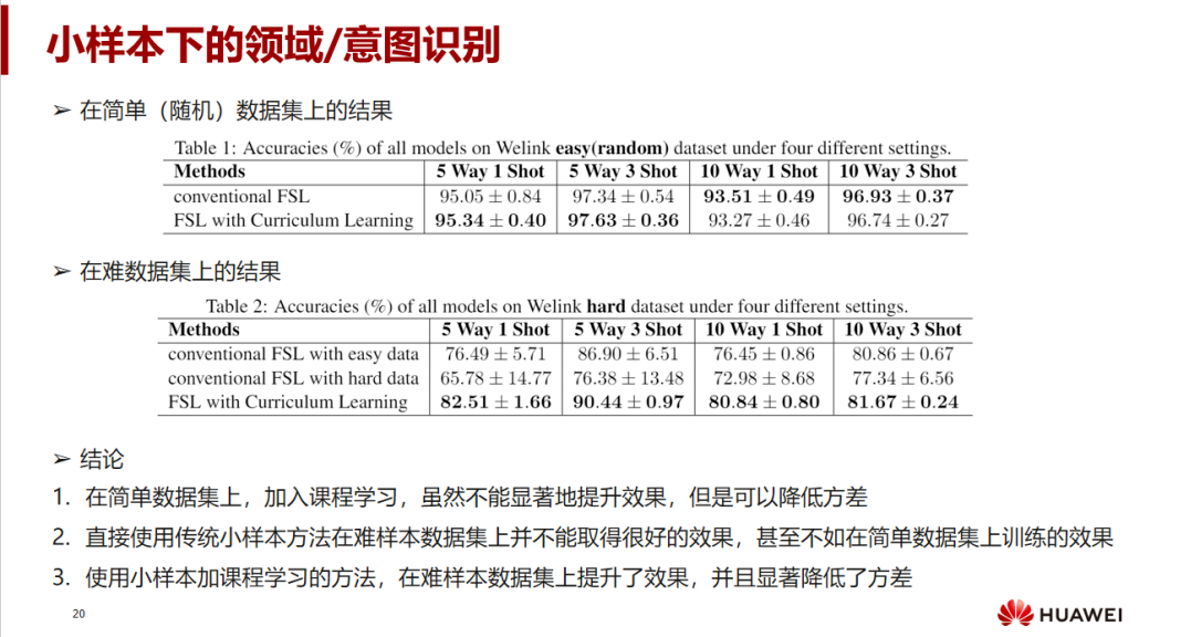 可以得到的结论是,在简单数据上,课程学习虽然不能显著提升效果,能提高 3 到 6 个点的准确率,但确实可以降低方差(方差就是说原本我随着训练的难度,测试难度越大,好跟不好差距特别大),而且直接使用传统的小样本学习的方法,在难的样本里其实并不能取得很好的效果,之前能达到准确率 95% 这样的效果其实是不可信的。同时加入小样本加课程学习,在难样本上提升效果比较明显。