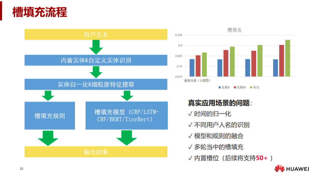 应用场景中,槽填充会有哪些问题呢?首先是时间归一化,时间表达会比较多。另外不同的客户人名可能不太一样,人名表达也具有多样化,不同用户人名的识别也会带来一些难度。同时模型和规则的融合方法也存在挑战。最后就是多轮中可能会有一些槽填充的问题。新平台里面需要内置一些槽位,这样用户用起来可能会比较方便、简单。