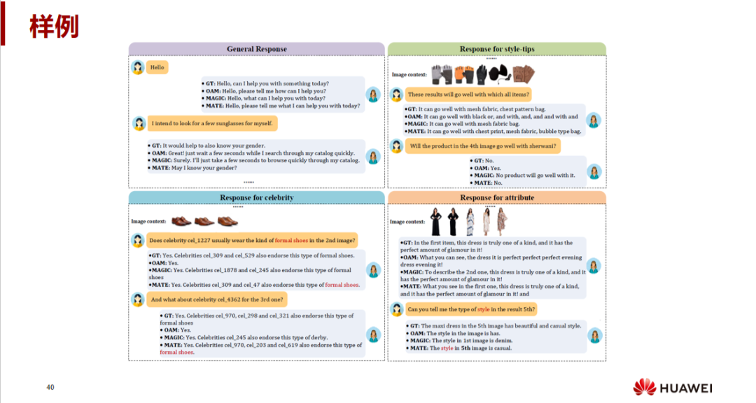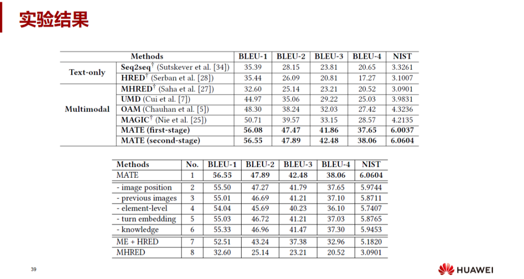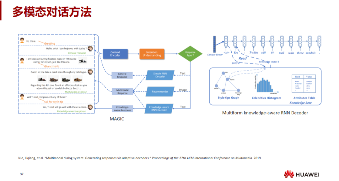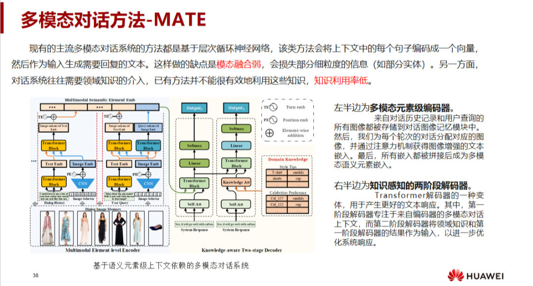 另外一方面虽然使用了属性三元组,但其实并不能很好地有效利用这些知识,即知识的利用率比较低,所以华为采用了一种叫做 MATE 的模型,它是基于语义元素集的、上下文依赖的一个多模态对话系统。将模型拆开来看,左边是一个多模态元素集的编码器,用来编码来自对话历史的记录,包括用户查询的所有图像,都存储在对话记忆模块。