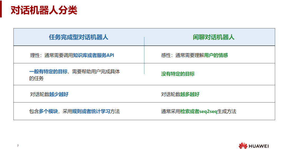这里将对话机器人做两个分类,第一类是任务完成型的对话机器人,第二是闲聊型对话机器人。上图表格是两种机器人的对比,我们可以称之为一个是理性机器人,一个是感性机器人。