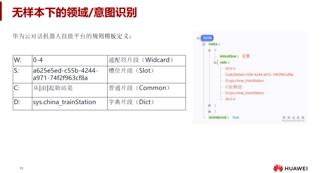 针对这些不同情况我们做了一些探索。先看如果在无样本情况下,如何做这样的领域一种识别,所以说华为云的一些对话机器人技术平台上,其提供了一些规则的方式定制,因为规则的话,一旦配置一条规则,其实它能泛化识别出大量的文本,在规则里面提供适配的一些通配符,包括它可以配置一些槽位的字段,甚至一些普通的字段,普通字段可能是一些 word,包括用户自己的字典,这些都可以配置。