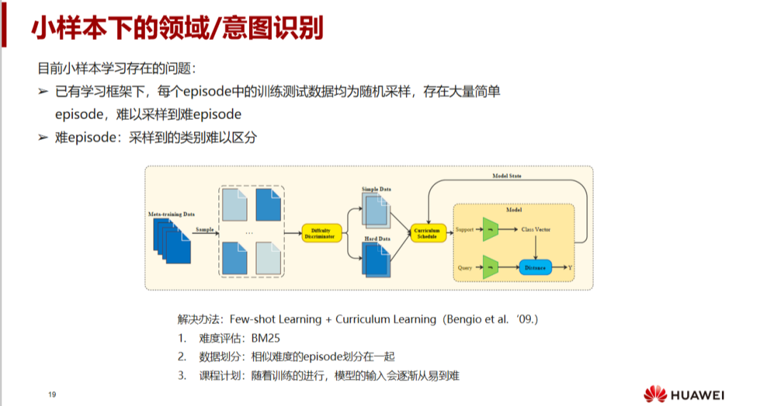 第二个问题,在没有大量的数据前提下,也就是小样本场景下的领域意图识别如何处理。这种情况下,随时会加一些新的类别,而且新的类别下可能几条数据,无法跟之前的数据一起训练。