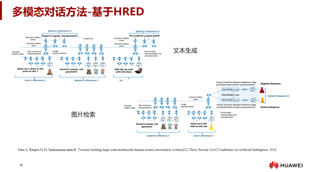 对于端到端的对话管理,也可以使用 HRED 模型,该模型非常简单,但是它仅支持单模态。在 HRED 里面,只需要把图片信息加入,把图片编码,编码之后再融合文本,文本通过 RNN 得到向量,把这两个拼接在一起,再通过一层上面的 RNN,这就是现在用的比较多的基于 HRED 构造的多模态的 HRED 模型。