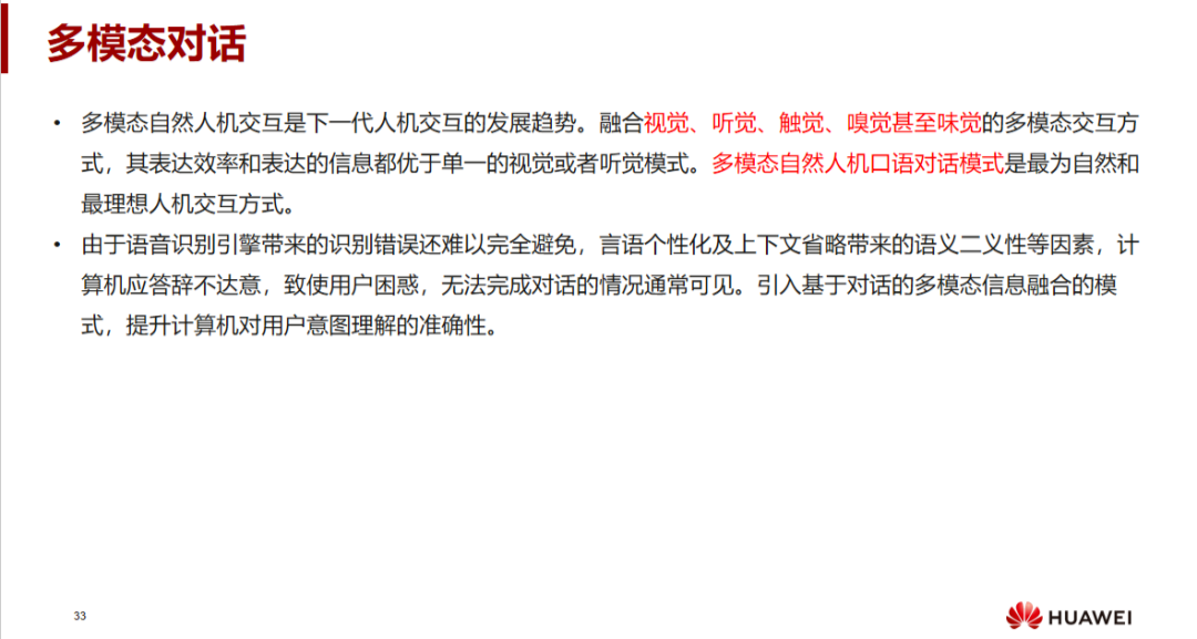 多模态自然人机交互系统是下一代人机交互系统的一个发展趋势,它可以融合视觉、听觉、触觉、嗅觉甚至味觉,表达的效率比单一的视觉甚至单一的文本丰富性更强。多模态自然语言人机交互的对话模式,是目前最为自然而且最理想的人际交互方式。