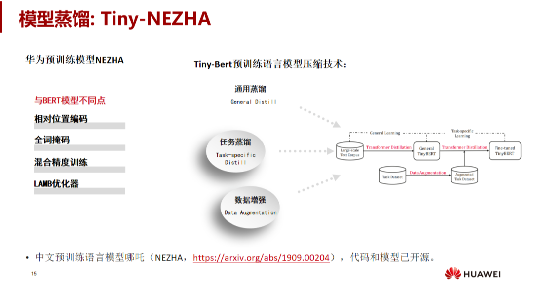 第二块就是我们的蒸馏技术 Tiny-BERT,会在两个地方都做蒸馏,一个是在预训练中的通用蒸馏,通用蒸馏即在训练里面也可以做蒸馏。第二个就是在任务相关的其实也可以做蒸馏,也做了一些数据增强的工作,中文系列模型 NEZHA 的话已经也开源了,代码和模型可以公开下载。