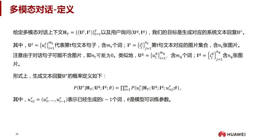 多模态的简单定义是,给定多模态对话上下文,包括用户的询问,目标是生成对应的系统的文本回复。针对上文电商的场景,提供的可能只有文本跟图片,当然后面都可以扩充,还可以加语音甚至其他某些信息,那么这里面可能不含图片。它形式上就是你只需要输入一个历史上下文,再加上用户的 query,需要生成的是系统的回复。
