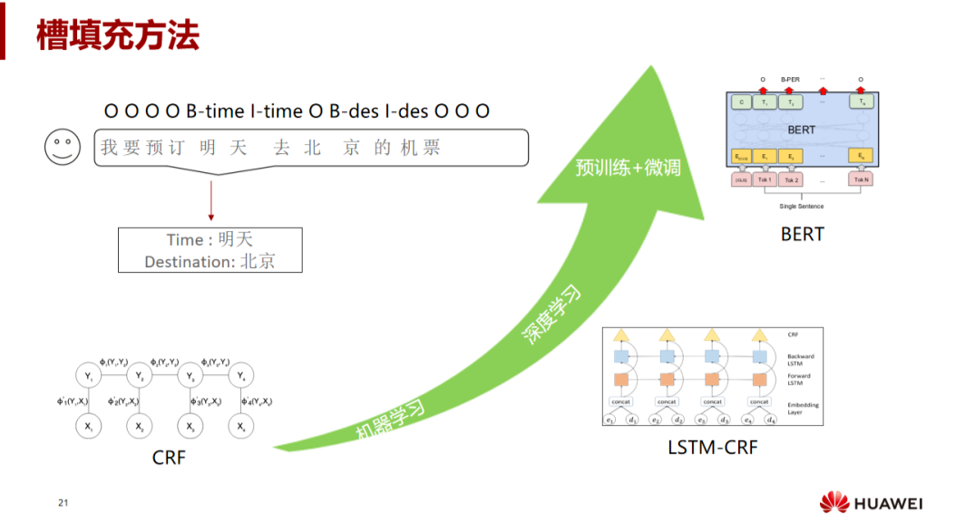 再来看槽填充方法。比如说用户想要预定明天去北京的机票,机器人需要提取出来 time 是明天,而 destination 是北京,通常在实际使用中明天可能会需要转成一个具体的时间表达,这样一个任务可以转换成一个序列标注任务