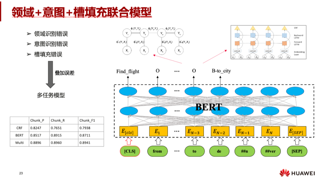 如上图模型,融合 bert 和 crf 对领域、意图、槽联合建模,实验结果也证明确实会带来较大的提高。传统的 CRF 模型可能效果确实不是很好,最后的 ChunkF1 可能只能达到 0.79 的准确率。通过 BERT 它可能达到 0.87 的准确率。加入领域识别槽填充这一系列后,最后的 ChunkF1 大约能提高大概两个点。