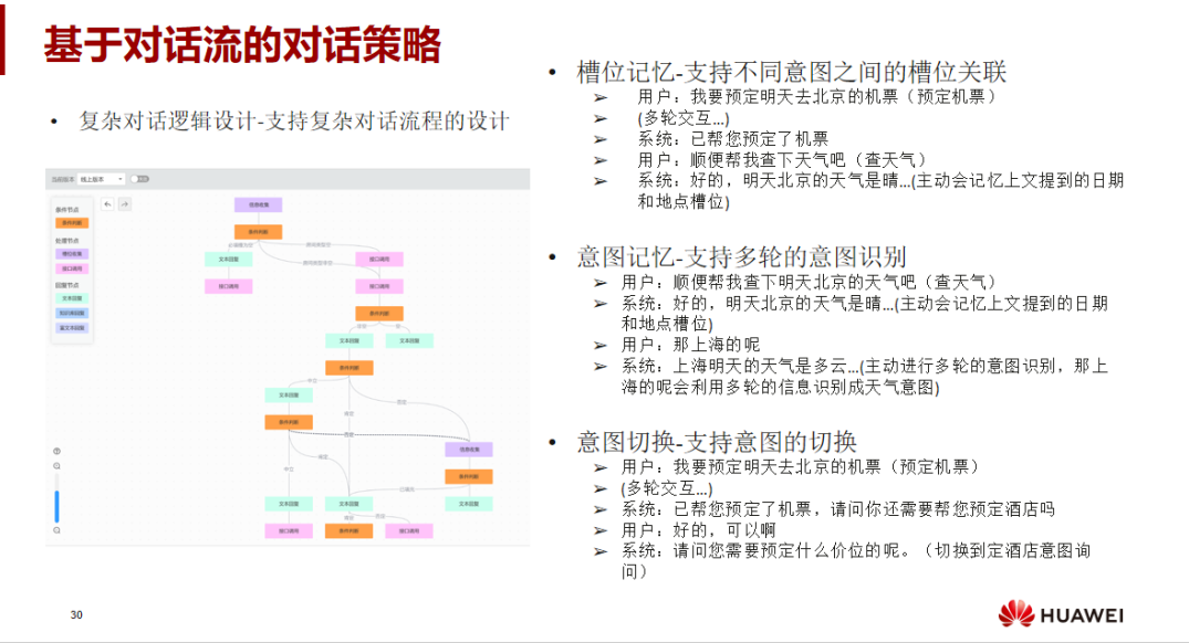 但是在对这种对话流程方案进行设计的时候,也要解决很多实际上的问题。一个是槽位记忆的问题,它需要支持不同意图槽位之间的关联,例如在订票时,已经说了时间地点,那么在说查天气的时候它不应该反问你要查什么地方的天气。第二个是意图记忆的问题,它需要支持多轮的意图识别。例如用户在问天气时,问 “那上海的呢?” 就会利用多轮的信息识别成天气意图。