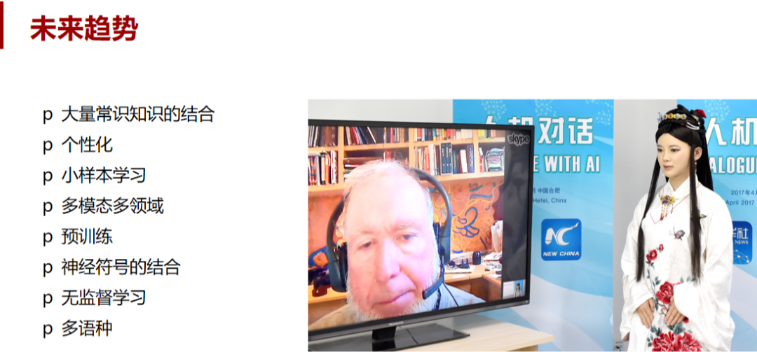 以上就是我们在对话机器人上的一些进展和工作。针对机器人的这个行业来说,我们是希望每个人都能享受到对话人机交互的乐趣。即使跨洋彼岸,机器人也能够跟用户更好地进行交流,甚至机器人能够服务好用户。上图是一张图片,显示器里面是凯文・凯利,右边是科大的佳佳机器人,当时是做了一个跨洋跨语种的对话。但要把这样的事做好,其实是一个很大的挑战。