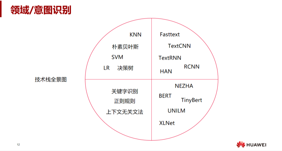 领域识别、意图识别其实它任务是一样的,都是一个分类任务。在上图的圆圈里,是我们涉及到的一些典型的算法,在领域、意图识别里面。左下角就是一些规则的方法,前面对话机器人的历史介绍的时候有提到过,主要包括一些关键字的识别,正则规则,然后上下文无关文法。这一块其实工业界机器人平台也有在使用。