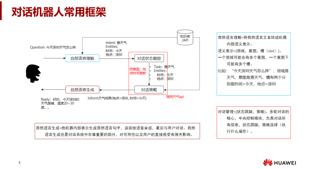 自然语言生成模块的目的就是把对话管理的输出,转成一个用户能够理解的自然语言描述,这个时候它会生成一个回复就是:“好的,今天深圳的天气是晴,温度 20~30 度。”这么一条自然语言描述。这就构成了非常典型的对话机器人的常用框架。
