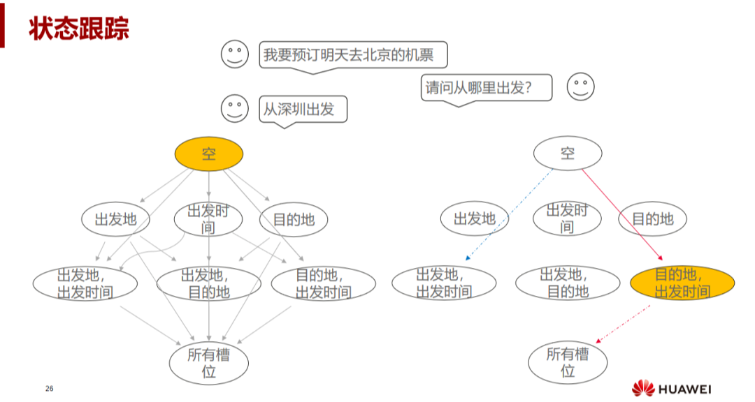 右边的结构是随着用户跟机器人的对话同时进行的。用户说 “我要预定明天去北京的机票”,这时用户状态从空就跳到了目的地出发地这样一个状态,并随着问题交互的进行,直到填充所有的槽位。这样一个过程是通过状态跟踪来做的。