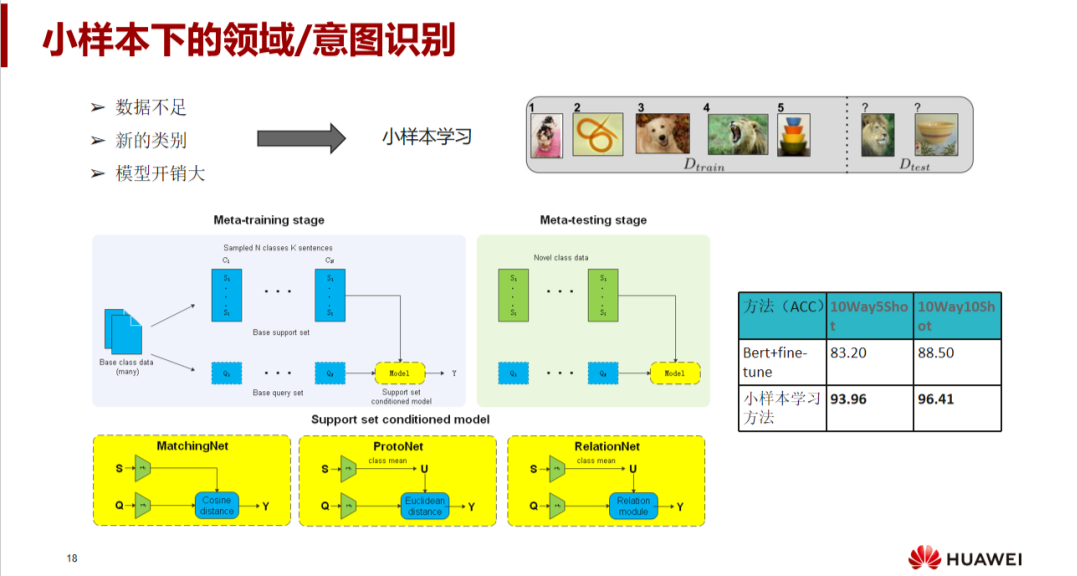 度量方式分很多种,比如 MatchingNet 是匹配的网络;原型网络 protoNet,唯一的不同就是 distance 计算不太一样,此外还有 relationnet。我们在小样本上跟传统的 BERT 预训练加微调的方式确实做了对比。