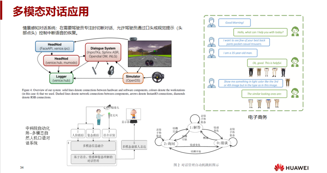 多模态对话的应用目前不是很多,但也有文章对此进行了研究,一个是情感感知对话系统,在驾驶时,驾驶员需要集中精力去关注路况,但是他很难腾出手去操作一个界面,这是一个很经典的多模态问题,它可以通过驾驶员,可以通过口头或者是视觉的提示,甚至是语音文本,驾驶时语音识别效果可能会更差,那么能不能通过视觉的信息,手势的信息去理解,这是一个非常典型的场景。
