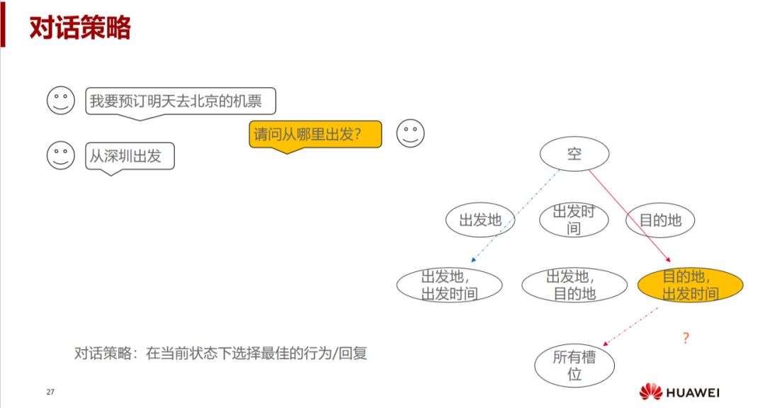 再来看对话策略,对话策略的目的是告诉机器人应该说什么。看一个例子,按照上图红色框所示,根据输入的当前状态的信息,用户已经输入目的地了并告知了出发时间,系统应该去判断,发现出发地是未知的,这时的策略也很简单,提问 “请问从哪里出发?” 而不是 “请问去哪里?”。
