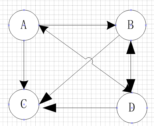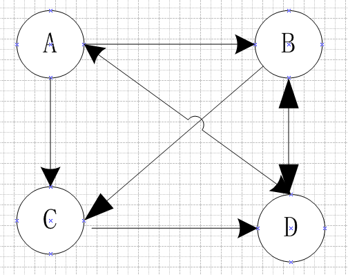 实际中互联网上网页可能不满足强连通性,有的网页不指向任何网页。如果按照上面矩阵相乘的计算,会导致前面累计的转移概率被清零,这样下去,最终的得到的概率分布向量所有元素几乎都为 0。假设我们把上面图中 C 到 D 的链接改成 D 到 C,C 变成了一个终止点,得到下面这个图: