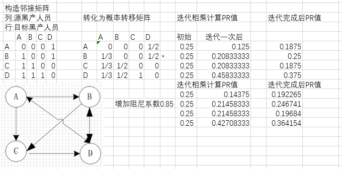 初始化阶段:人员通过链接关系构建有向图,有链接关系的初始化 PageRank 值为1,没有链接关系的初始化为 0,从而构造了邻接矩阵;之后使用邻接矩阵构建概率转移矩阵;