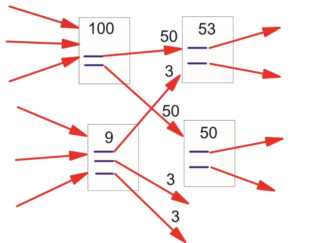 在一轮更新人员 PageRank 值的时候,都是将其 PageRank 值链出,指向出链上的每个人员即可获得相应的权值,每个人员指向自己的入链所传入的权值和就是其新的 PageRank 得分。
