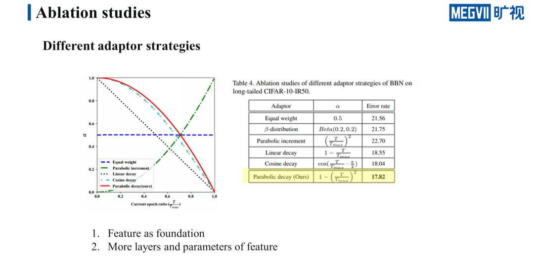 所以我们倾向于让特征去花更多的时间来学习,当特征学得足够好,再去关注 tail 类的分类性能,当然也不是说特征学的时间就越久越好。总的来说网络的性能对于不同的递减策略来说也不是很敏感,比如 Cosine decay 相比于我们使用的 Parabolic decay 也就差了仅仅 0.2 个点而已。