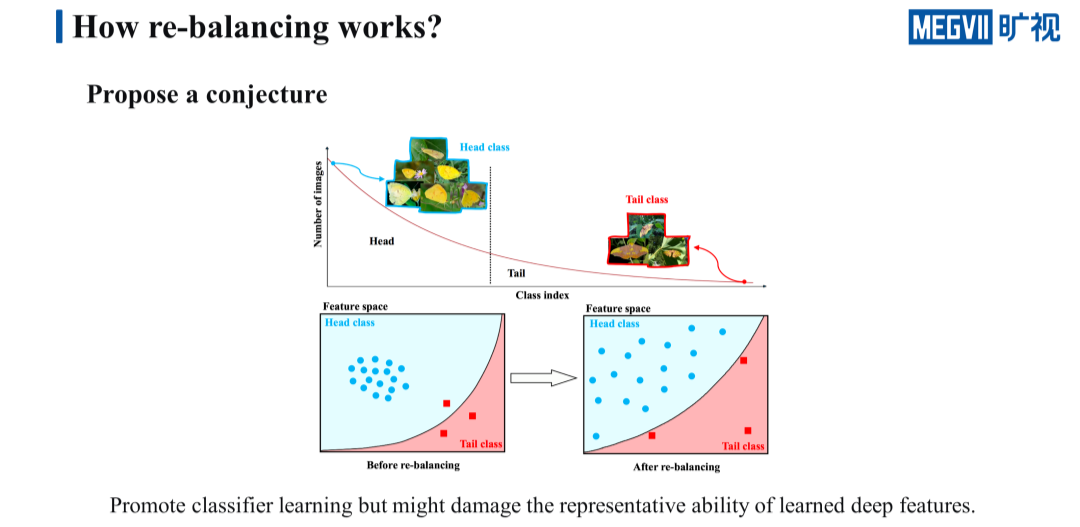 所以我们提出了这样一个猜想,尤其是 re-balancing 这样一个策略它能够工作的机制在于它提升了分类器的性能,但是它又会在一定程度上损害特征的表示能力。我们怎么去证明这样一个猜想呢?