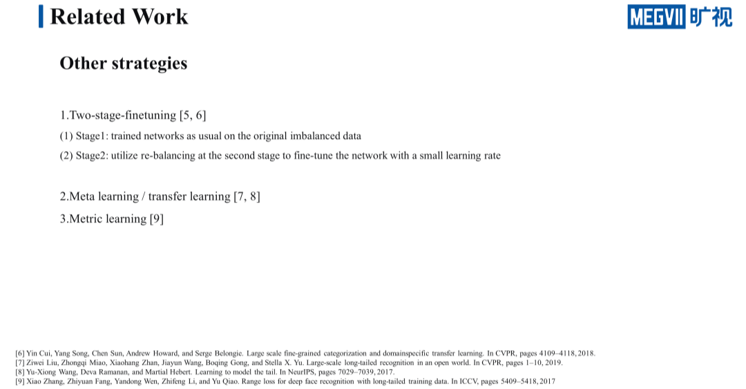 到第二阶段,会以一个很小的学习率,使用 re-weighting 或者 re-sampling 进行 finetuning,这种简单有效的方法就能够达到比较好的效果。除了 Two-stage finetuning,还有一些其它相对来说没那么主流的方案,比如 Meta learning,transfer learning,和 learning to learn 等,包括 Metric learning 也会有一些用来解决长尾问题的思路。