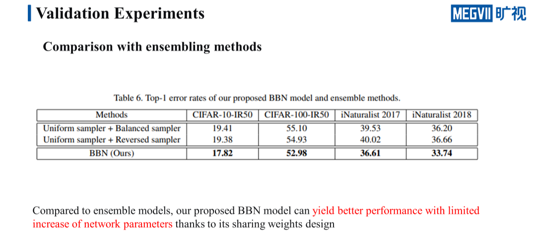最后我们再与 ensemble 的方法进行对比,BBN 的 CB 和 RB 两个分支如果完全不进行权重共享,看起来就和模型集成有一些相似。可以看到的是无论是 Uniform sampler+Balanced sampler 还是 Uniform sampler+Reversed sampler,提升的效果都比 BBN 差很多。