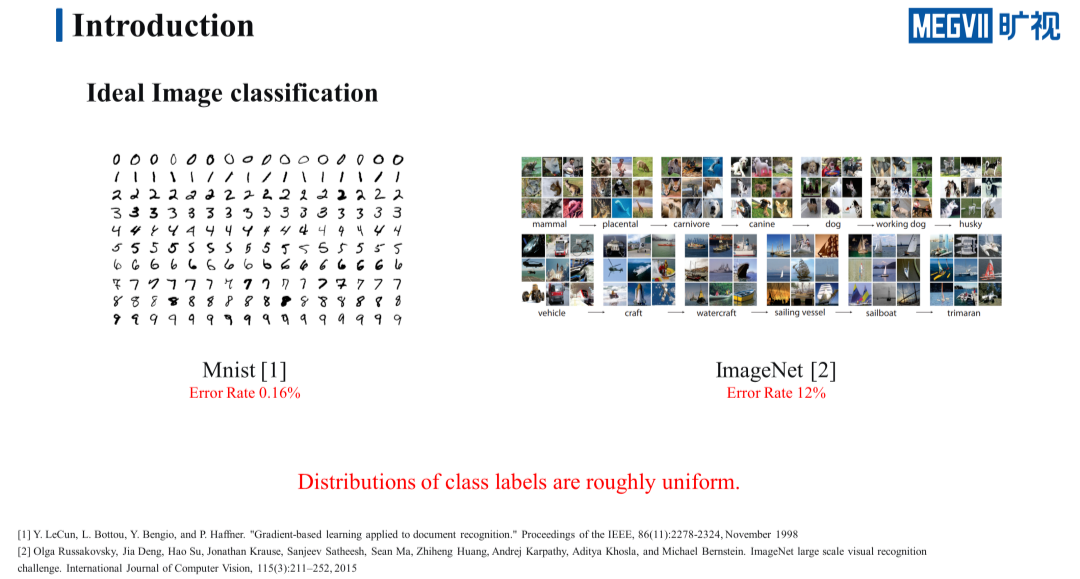 在介绍长尾识别任务之前,我们先来看一下普通的图像分类任务。Mnist 和 ImageNet 是两个比较有名的图像分类数据集,Mnist 是一个手写字体的分类数据集,主要区分 0~9 十个数字。ImageNet 是一个比较庞大的分类数据集,一共包含了 1000 个类别,涵盖了现实世界里各种常见的类型。