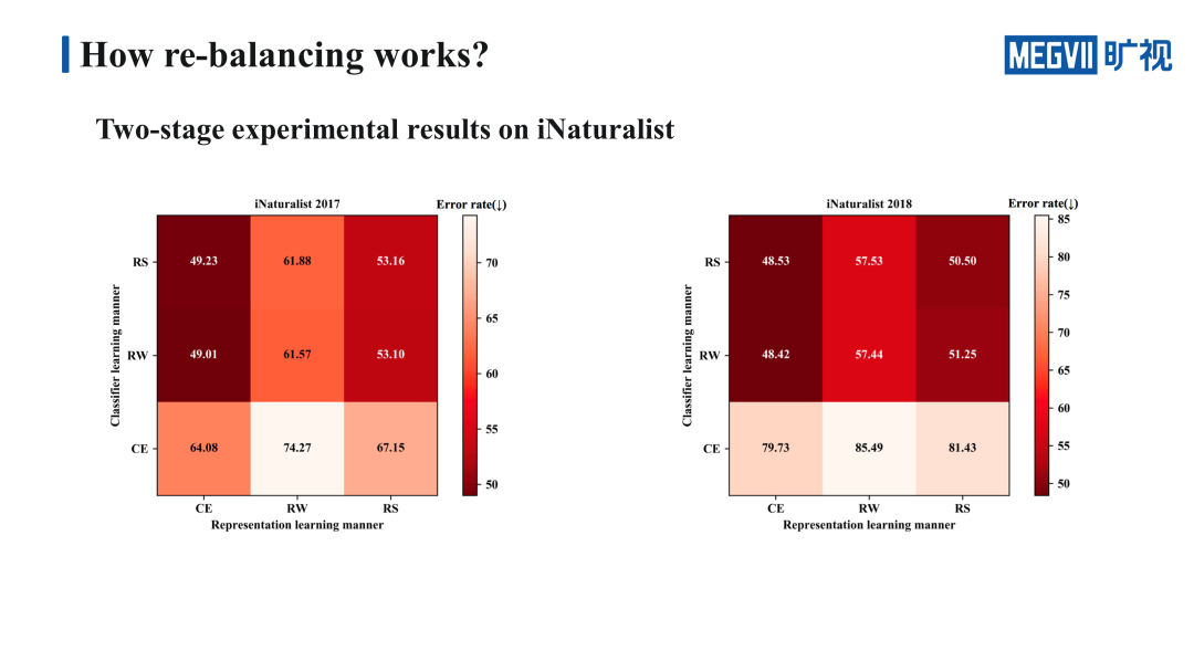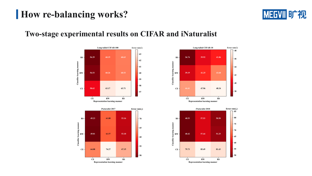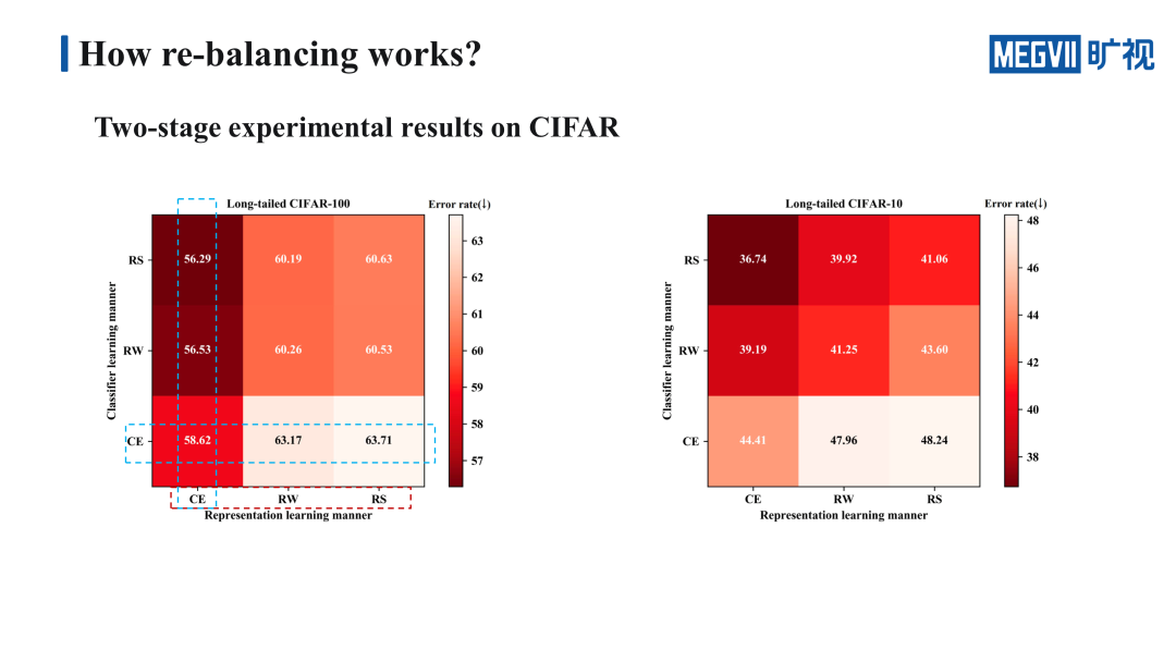 我们重点看一下 Long-tailed CIFAR100 上的结果,这里的九宫格横轴代表的是特征学习的方法,纵轴代表的是分类器的学习方法,九宫格里格子的颜色越深,代表错误率越低,效果越好。