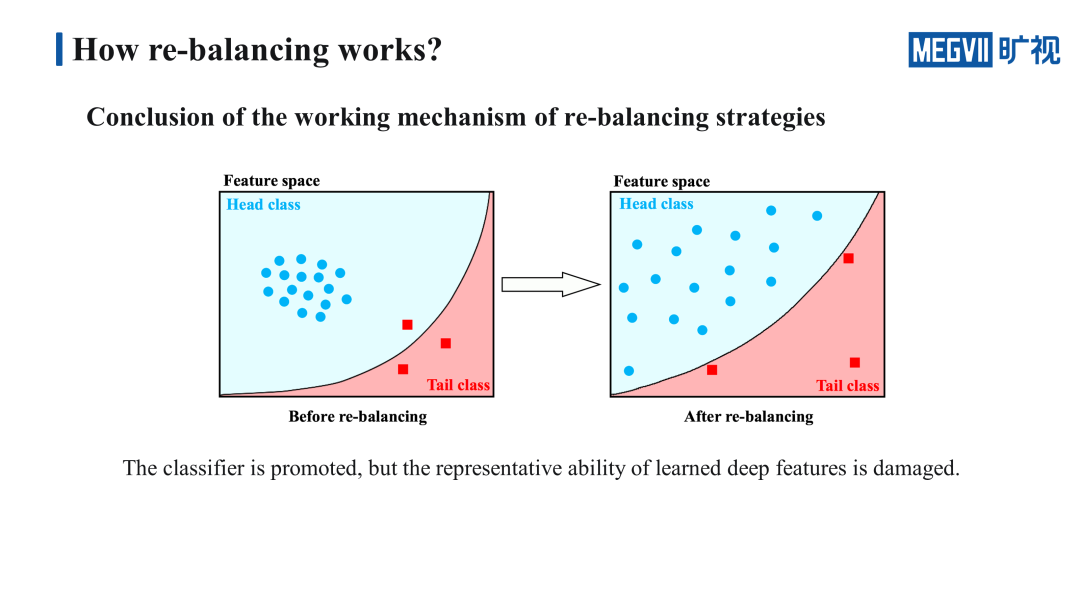 右边进行了 re-balancing 训练的特征空间则是完全相反的,它的决策边界向 head 类靠近了一些,所以不会再将 tail 类错分成 head 类,它使两个类各自的特征向量聚得相对松散了一些。这张图里簇的松紧程度代表特征的好坏,而决策边界的位置代表分类器的好坏,显而易见左边的特征好,右边的分类器好。