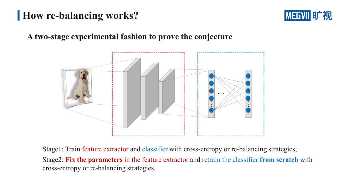 我们设计了一个 Two-stage 的实验来证明我们的猜想。首先在第一个阶段,使用 cross-entropy 和 re-balancing 的策略去训练整个网络。在第二个阶段我们会把第一个阶段训练得到的特征提取器的参数固定,然后重新训练分类器,训练分类器的方法也是使用三种不同的策略,这样我们就可以得到一个 3×3 的九宫格。