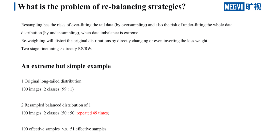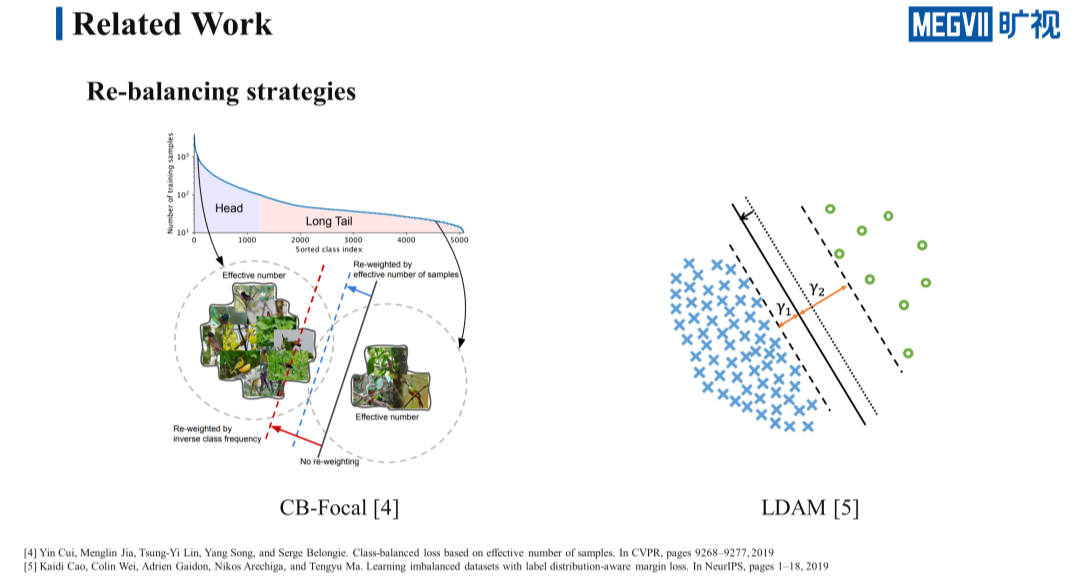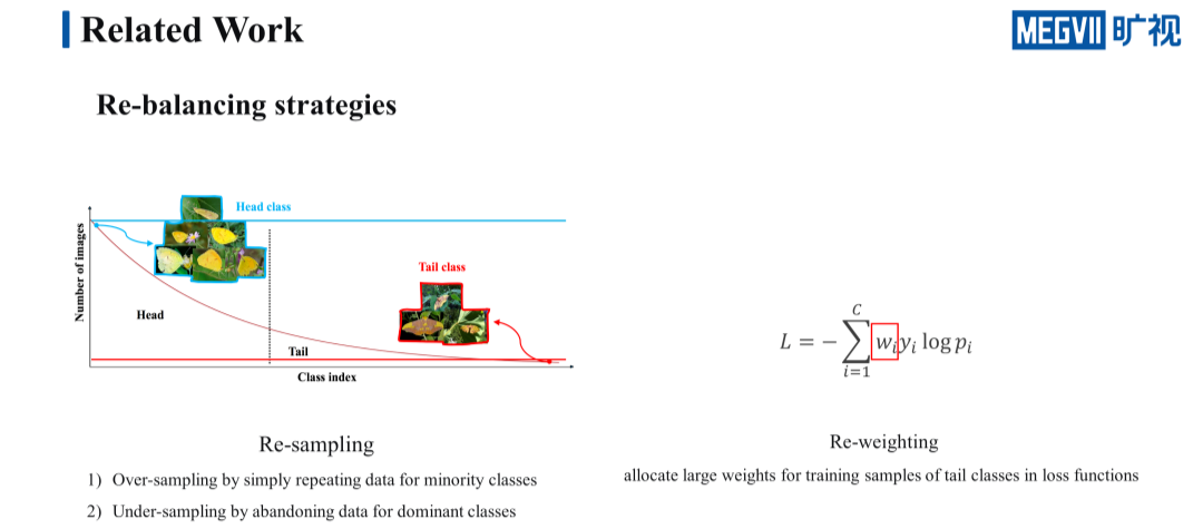 那么在面临这种长尾问题时都有哪些解决方案呢?目前作为主流且有效的方法是 re-balancing 一类的方法,re-balancing 可以细分成两类,分别是 re-sampling 和 re-weighting。