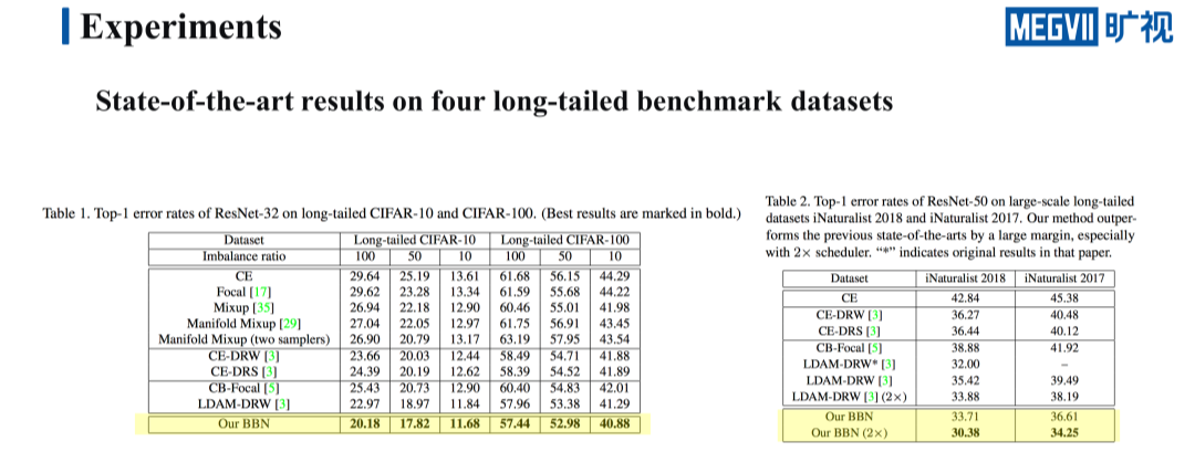 我们来看 BBN 的实验结果,首先是几个主要的长尾 benchmark 上的实验结果,我们一共在 8 个数据集上利用三种不平衡比例进行了实验,分别是 long-tailed CIFAR10,long-tailed CIFAR100,以及两个大型的长尾数据集,iNaturalist 2017 和 iNaturalist 2018。