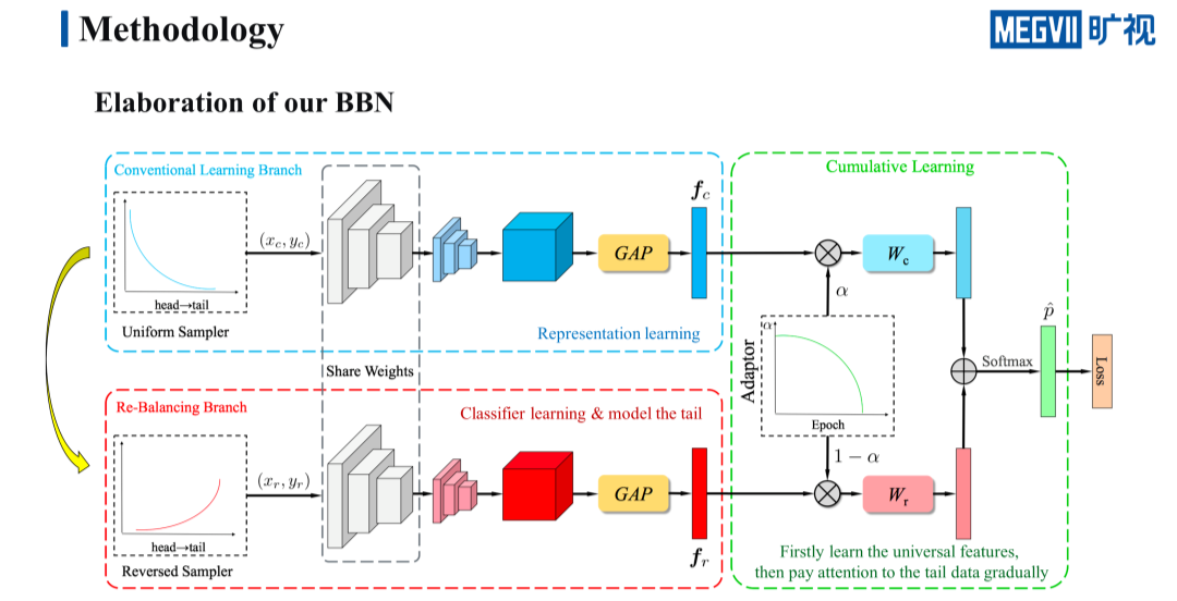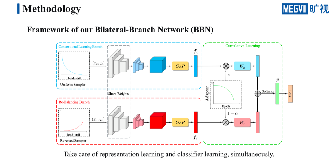 基于这样的目的,我们提出了一个全新的 framework:BBN。BBN 的出发点是希望可以兼顾特征的学习和分类器的学习。为此我们设计了两个分支,一个分支的作用是尽可能保留 class-entropy 的特征表示能力,另一个分支的作用则是提升 tail 类的分类性能。