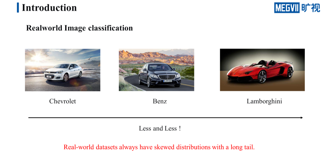 我们以图中的三辆车为例,这三辆车从左往右依次是雪佛兰、奔驰还有兰博基尼,显然这三辆车型的价格是越来越昂贵的,在现实世界里出现的概率其实也是依次减小的。像这种类别样本的数量逐级递减的情形就是我们所说的长尾分布,长尾分布在现实世界里无处不在。
