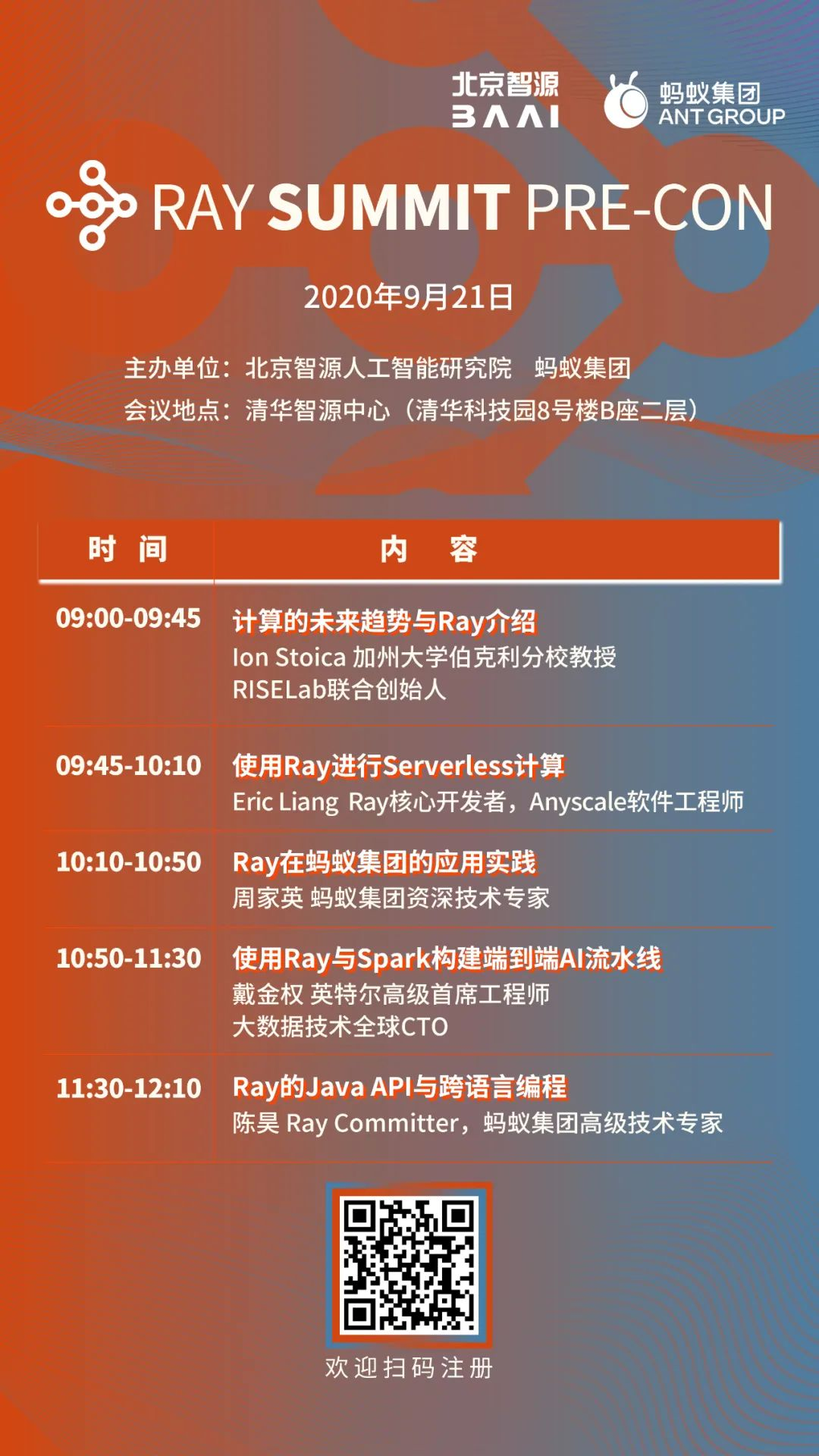 由北京智源人工智能研究院、蚂蚁集团主办的「Ray Summit Pre-Con」将于2020年9月21日(周一)09:00-21:10在清华智源中心(清华科技园8号楼B座二层)举行,RISELab联合创人,Ray项目核心成员,与国内应用先行者将共聚一堂,探讨下一代计算、解析Ray的核心设计,分享在生产环境中的实际应用经验。