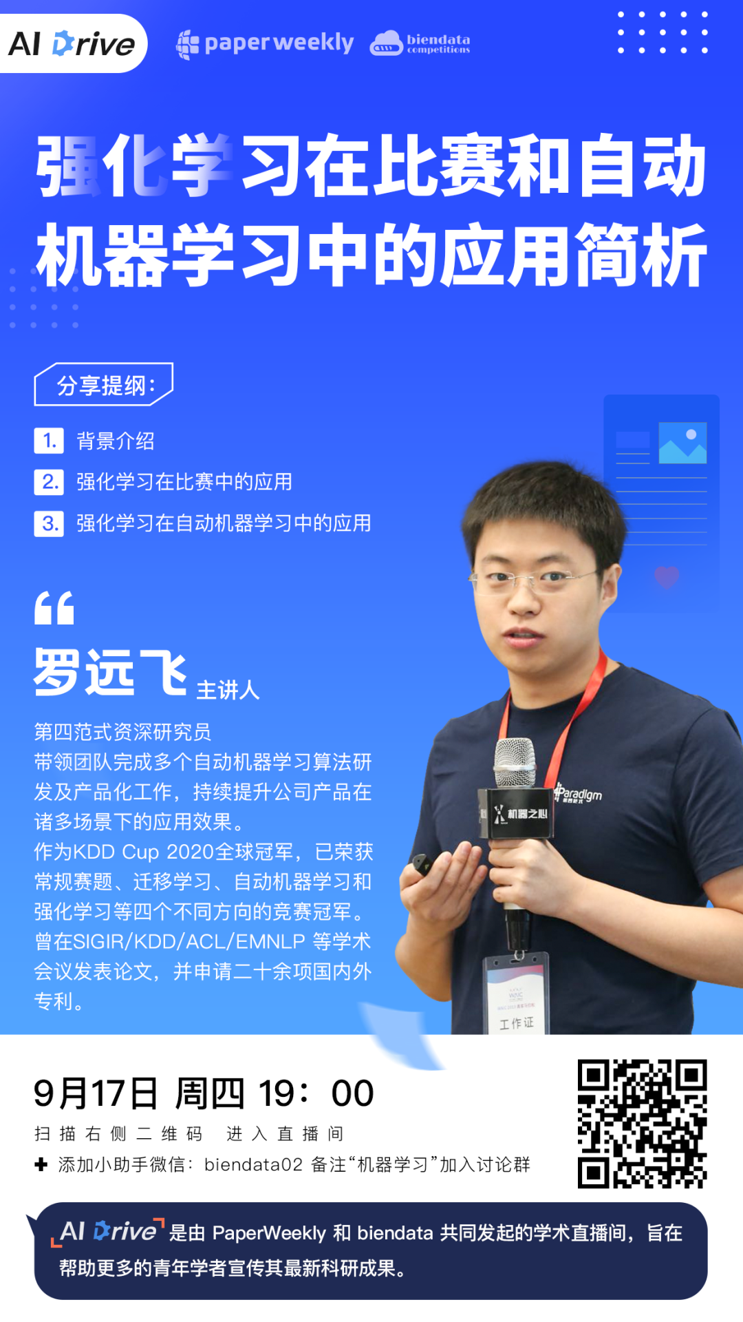 本期 AI Drive,我们邀请到第四范式资深研究员罗远飞,为大家带来强化学习在比赛和自动机器学习中的应用简析。对本期主题感兴趣的小伙伴,9 月 17 日(周四)晚 7 点,我们准时相约 PaperWeekly B 站直播间。