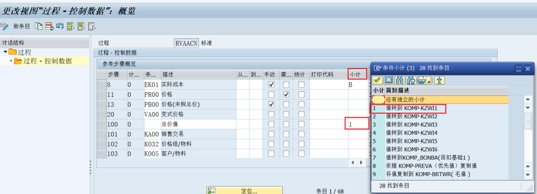 这些小计字段是用来接收定价配置中的特定条件金额. 如下图, 配置后,定价行的金额会写入KOMP-KZWI1 最终会写入VBAP-KZWI1.