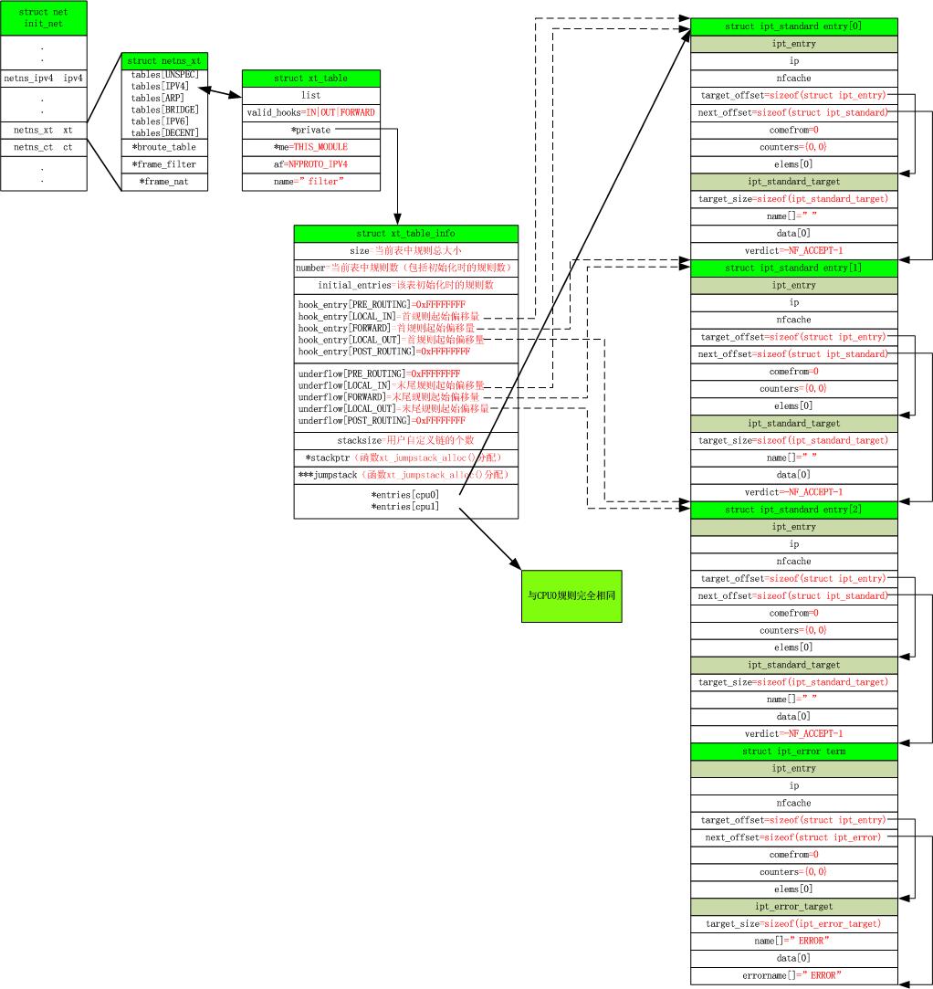 从代码层面来说,表是一个结构体,链是一个hook函数。学过c语言的同学对结构体应该是不陌生的,就是一些同类数据构成的数据集合。这时候你会发现表的定义和这个是类似的,但是hook函数可能就陌生了,那么hook函数是什么呢?hook翻译过来就是‘钩子’,就是在一个数据包/事件传输到下个点的途中,钩住它,然后监控、进行一些自己特定的操作,然后再传至下一个点。有没有发现这有点像arp欺骗,从中间截取你的数据包,然后进行一些操作,再传送至目标地址,这里只不过不是外部的处理,只是内部的一个合法的操作而已。