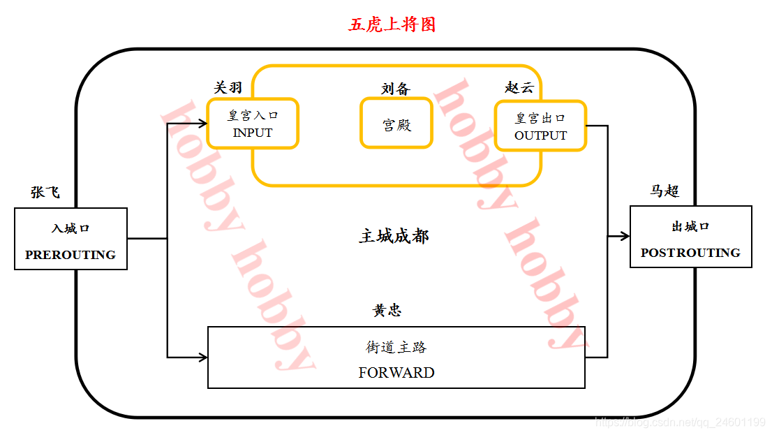 话说,三国时期蜀国那么一群战士打仗胜利归来,准备接受皇帝刘备的嘉奖,于是乎准备进宫,他们首先来到主城成都城门(PREROUTNING链),此时张飞负责把手入城口,查看了他们的身份证明(PREROUTNING链上的规则),确认了他们是即将要觐见的蜀国功臣们(符合PREROUTNING链上的规则),便打开城门欢迎他们进城;
