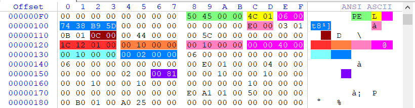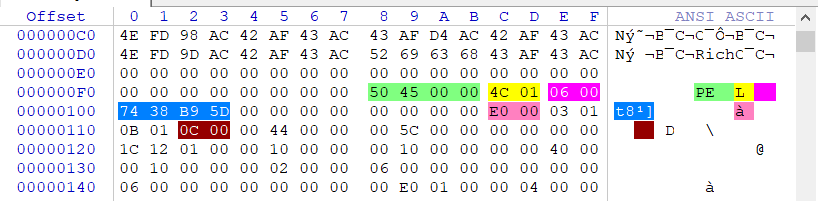 上图中我们以PE字符串为单位向后偏移36字节,即可看到文件偏移为120处的内容,此处的内容是我们要重点研究的对象。