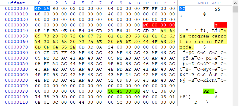 在DOS格式部分我们只需要关注标红部分,标红部分是一个偏移值000000F8h该偏移值指向了PE文件中的标绿部分00004550指向PE字符串的位置,此外标黄部分为DOS提示信息,当我们在DOS模式下执行一个可执行文件时会弹出This program cannot be run in DOS mode.提示信息。