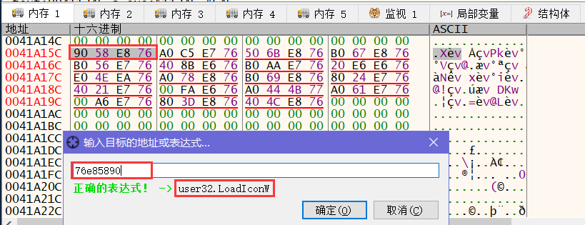 如上所示,可以看到该程序一共有3个导入结构分别是红紫黄色部分,最后是一串零结尾的字符串,标志着导入表的结束,我们以第1段红色部分为例,最后一个地址偏移0001A15C对应的就是导入表中的FirstThunk字段,我们将其加上ImageBase地址,定位过去发现该地址刚好是LoadIconW的函数地址,那么我们有理由相信紧随其后的地址应该是下一个外部函数的地址,而事实也正是如此。