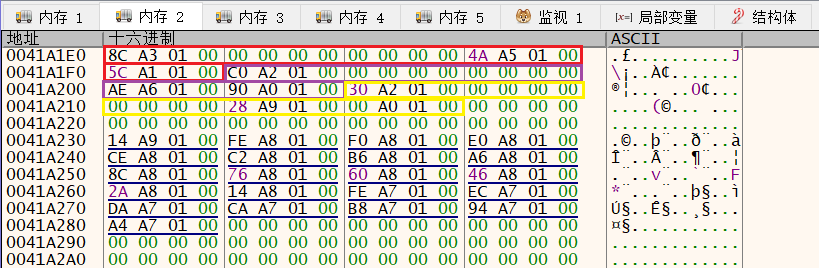 通过上面对导入表的分析我们知道了导入表RVA地址为 0001A1E0 此时我们还知道ImageBase地址是00400000两个地址相加即可得到导入表的虚拟VA地址0041a1e0,此时我们可以直接通过x64dbg的数据窗口定位到0041a1e0可看到如下地址组合,结合IMAGE_IMPORT_DESCRIPTOR结构来分析。