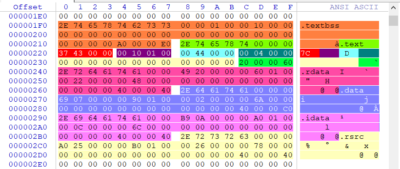 上图可以看到,我分别用不同的颜色标注了这六个不同的区段,区段的开头一般以.xxx为标识符其所对应的机器码是2E,其中每个区块分别占用40个字节的存储空间。