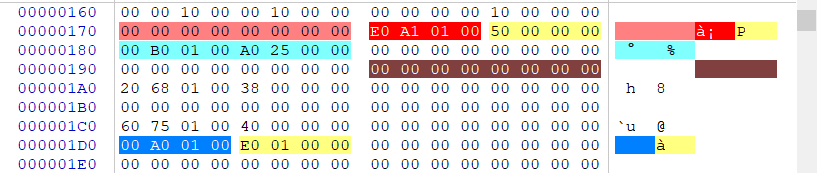 在文件FOA偏移为120的位置,可以看到标红色的地址0001121C此处代表的是程序装入内存后的入口点(虚拟地址),而紧随其后的橙色部分00001000就是代码段的基址,其后的粉色部分是数据段基址,在数据基址向后偏移1字节可看到紫色的00400000此处就是程序的建议装入地址,如果编译器没有开启基址随机化的话,此处默认就是00400000,开启随机化后建议装入地址与实际地址将不符合。