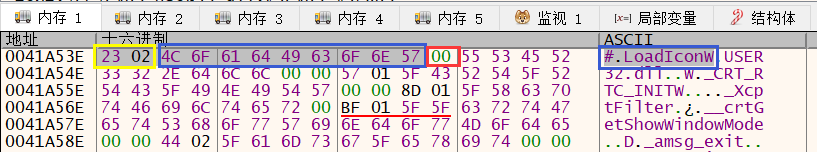 上图黄色部分是编译器生成的,而蓝色部分则为LoadIconW字符串与FirstThunk中的0041A15C地址指针是相互对应的,而最后面的00则表明字符串的结束,对比以下结构声明就很好理解了。