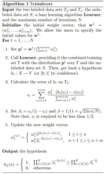 然后计算基分类器 在目标域测试集上误差,此误差与目标域相关程度有关。然后计算基分类器的权重 ,权重值越高就说明此基分类器的权重越大,相反权重变低。在得到新的权重以后,将新权重的样本数据中挑选并训练得到新的分类假设。