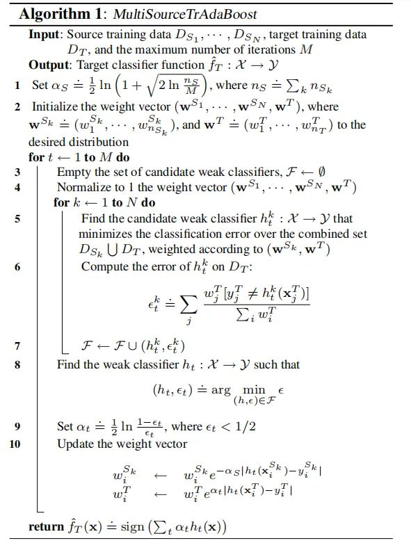 在算法 2(phase i)和算法 3(phase ii)中分别给出了该方法的详细描述。阶段 i 只是每个源训练数据的 AdaBoost 运行,输出 是所有候选弱分类器的集合。